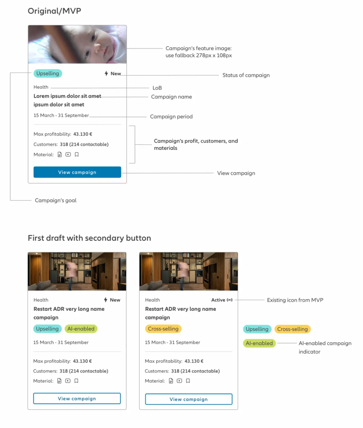 By aligning with existing SDW design patterns, the campaign card seamlessly integrates into the Campaign Management System, reducing development effort, increasing scalability, and ensuring a cohesive user experience across Allianz tools.