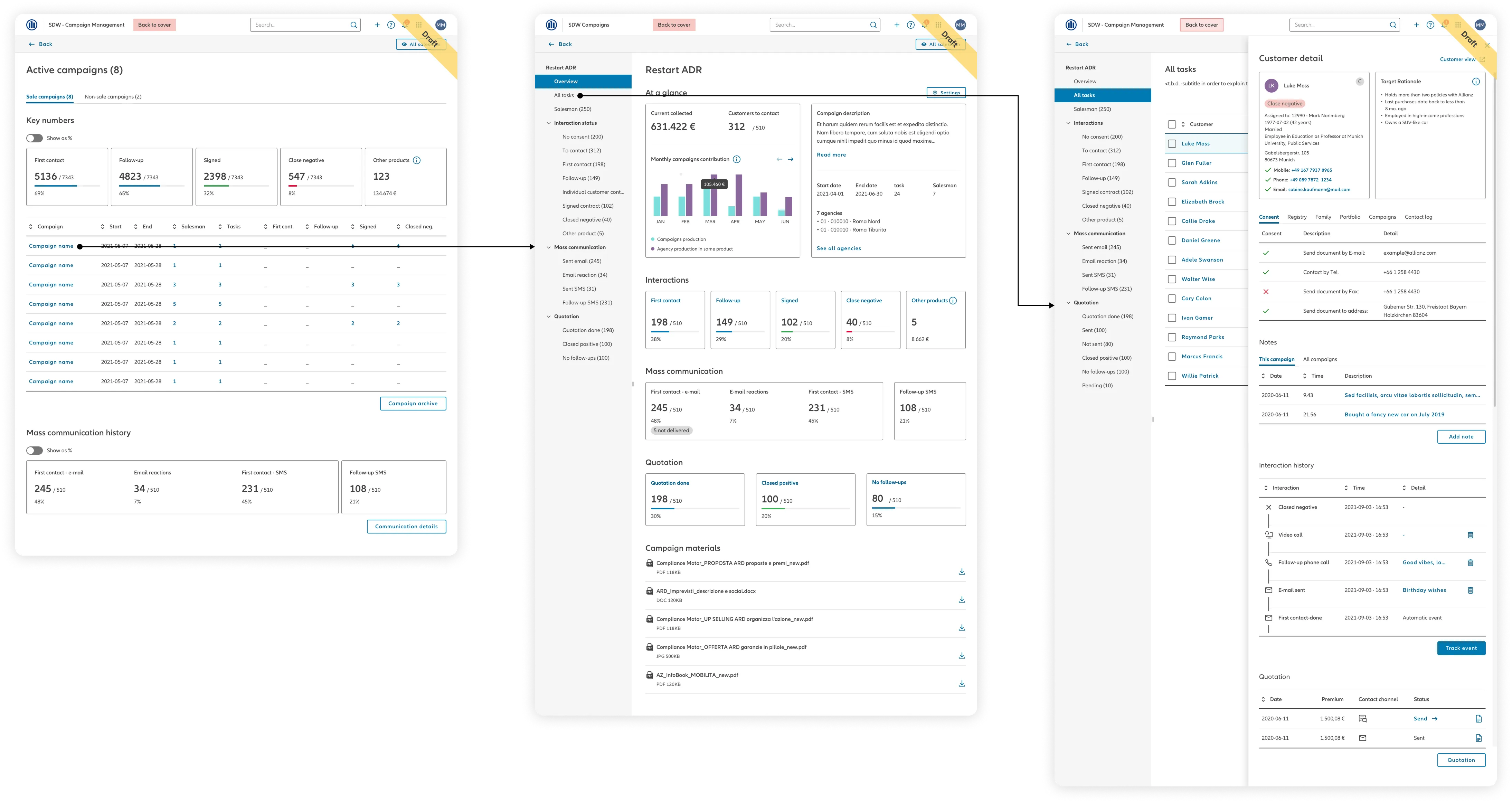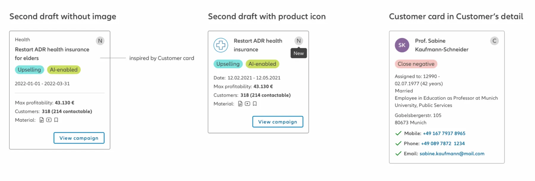 The design of the campaign card follows the structure of the Customer Card from Customer360, another SDW software, ensuring consistency across platforms. By leveraging this established framework, the campaign card benefits from a proven layout, making it more intuitive for users already familiar with Allianz’s ecosystem.