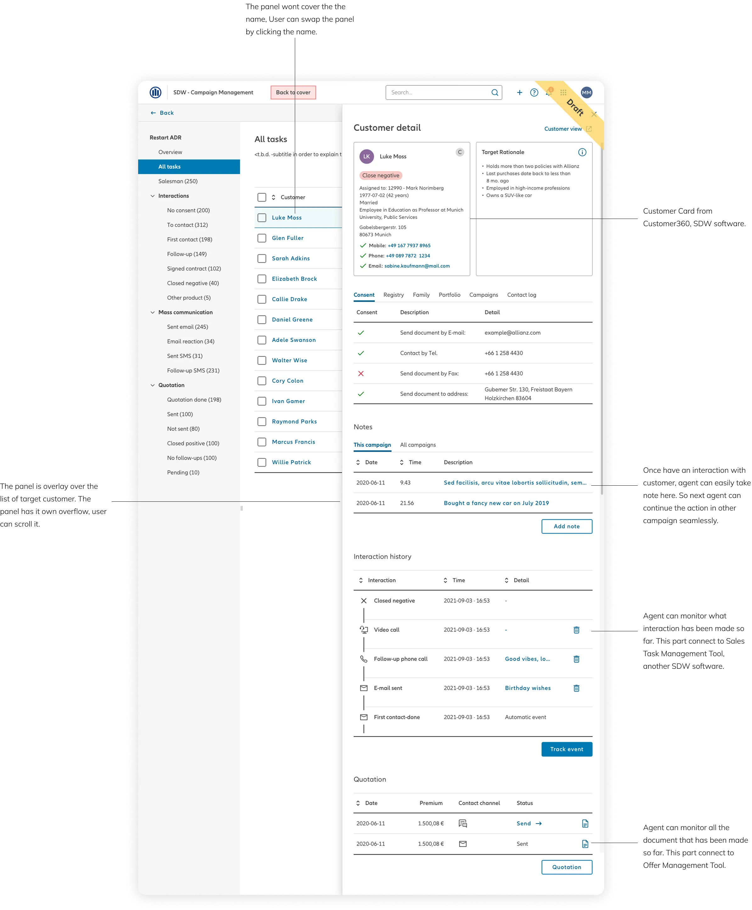 By integrating data from different SDW systems, the panel enhances efficiency, accuracy, and decision-making, ensuring that agents can quickly access key details such as customer interactions, campaign history, policy details, and engagement insights. The design follows NDBX standards, ensuring visual consistency, usability, and scalability across Allianz platforms.