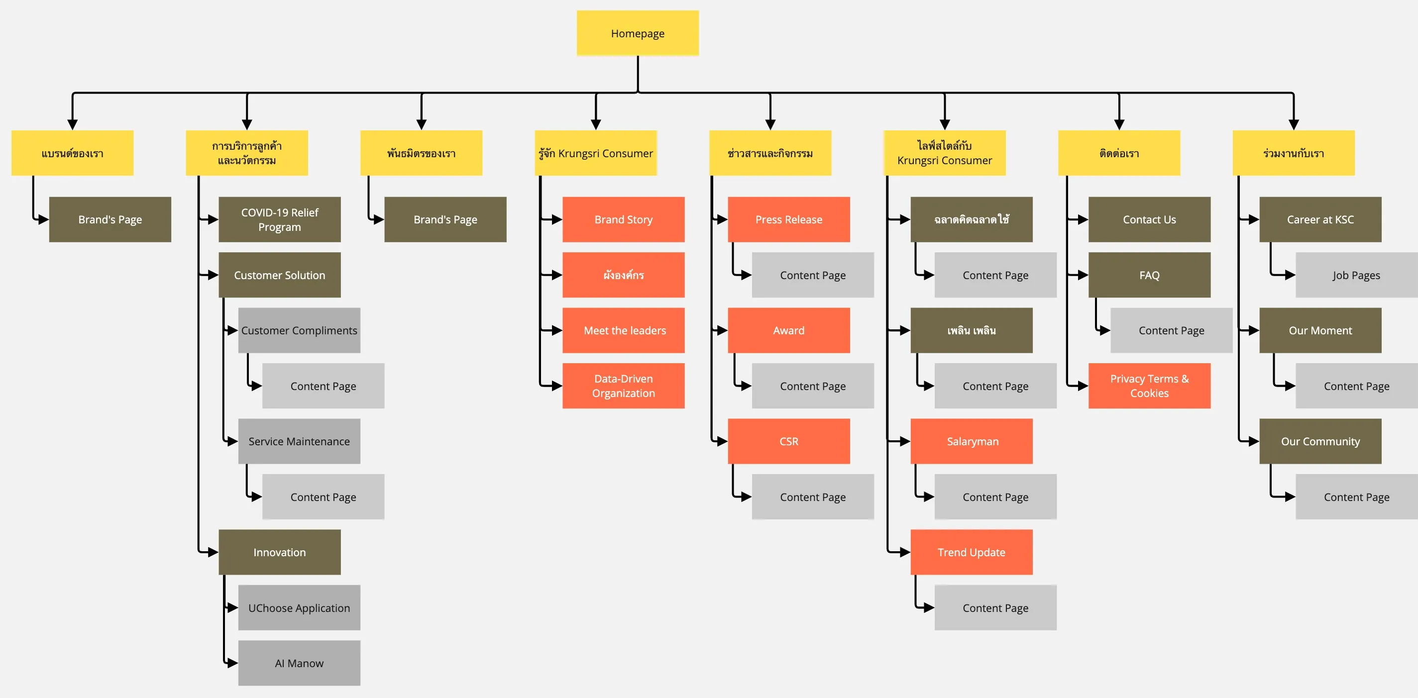 To bring clarity, consistency, and usability to the Krungsri Consumer digital experience, I developed a strategically structured sitemap that aligns with both user needs and business goals. The sitemap serves as the foundation for a website that not only functions as a traditional corporate platform but also integrates multiple layers of functionality, from product discovery to customer support.